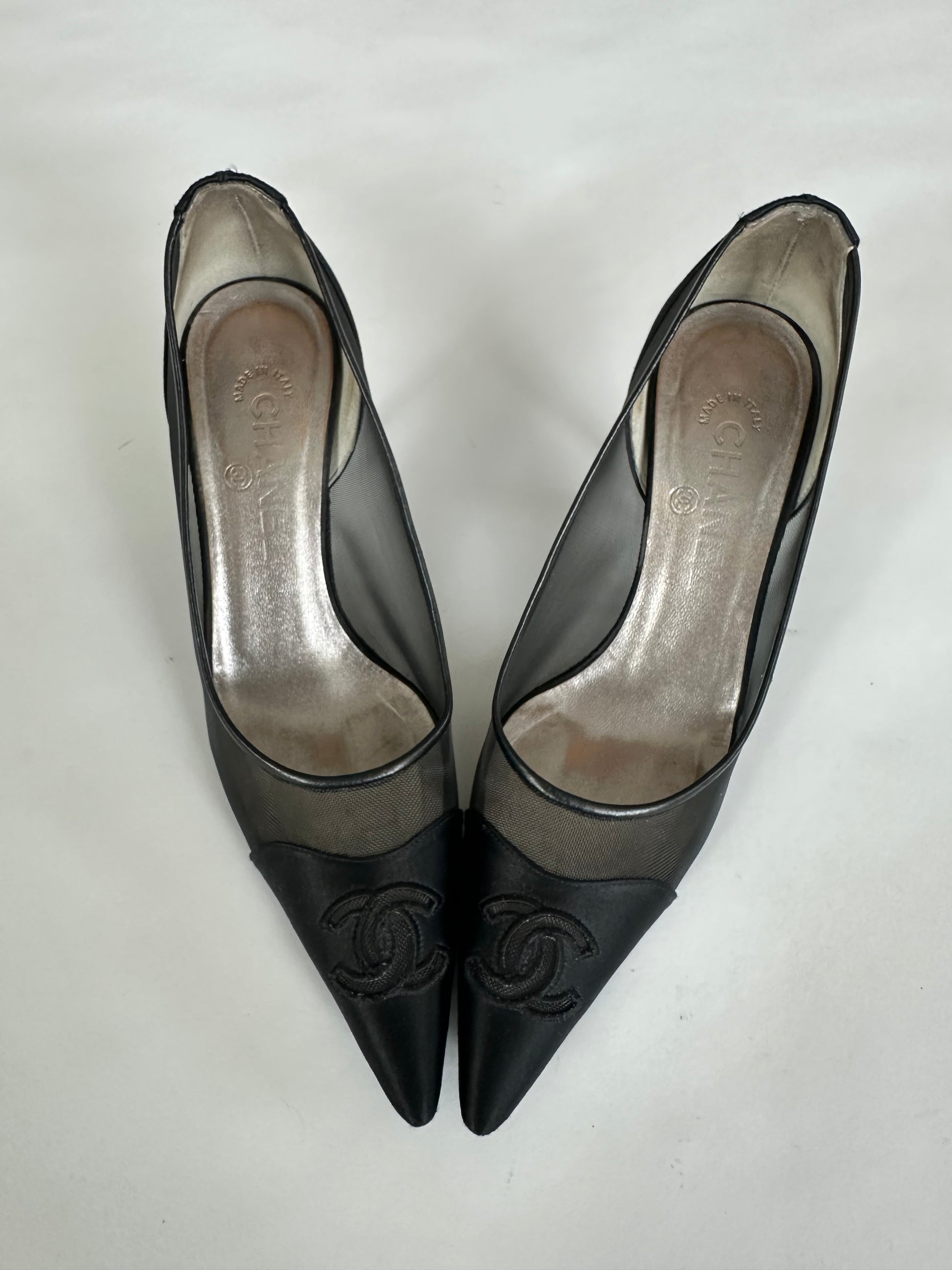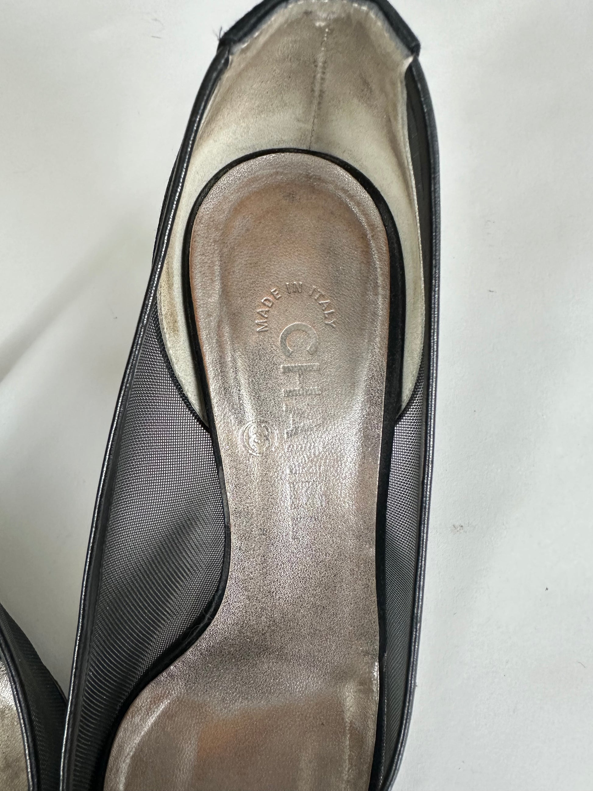 Black Chanel mesh heel with silky trim. Wonderful vintage condition. Some wear on heels and insole.